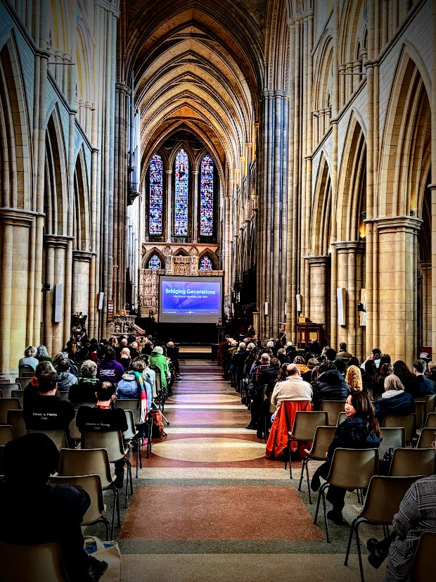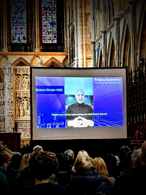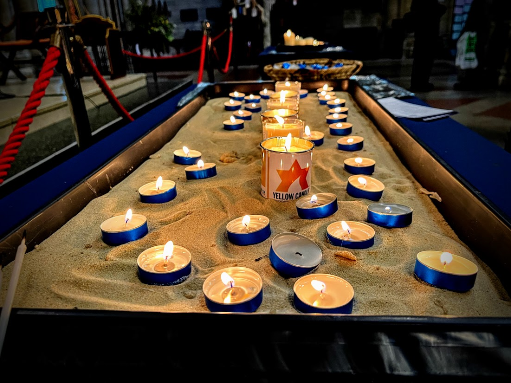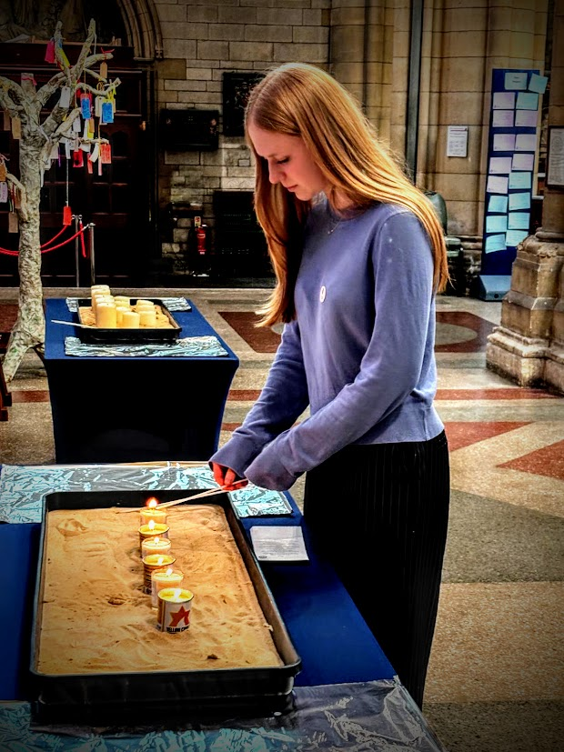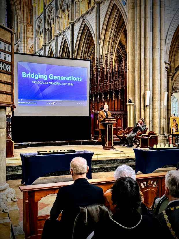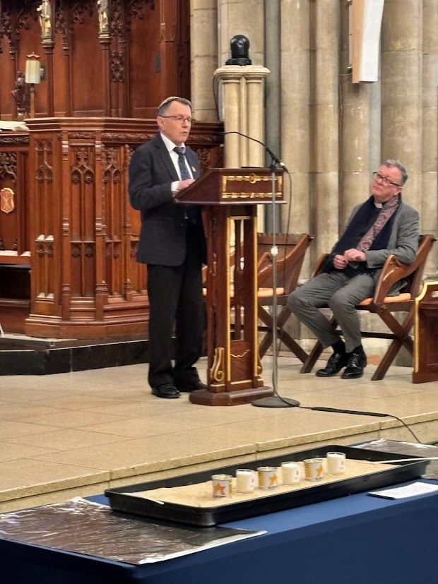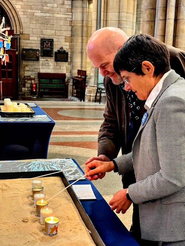 The well-attended service, whose theme was ‘Bridging Generations’, was led by Simon Robinson, the Dean of Truro Cathedral, and included a video introduction by Rob Rinder, poignant personal testimonies from Cynthia Hollinsworth and Susan Soyinka, poetry from Ben Barkow, and readings by students from Truro School. Six memorial candles were lit in memory of the 6 million inncluding one by Renate Collins, a Holocaust survivor, and then Jeremy Jacobson, the Kehillat Kernow Chair spoke. He was followed by Paul Kleiman singing ‘El Molei Rachamim’ the Jewish prayer recited at funerals and which has been specially adapted for HMD (see video at end of photos). The service ended with Adam Feldman reading out the traditional priestly blessing. Those attending then lined up to light memorial candles and to write pledges for action.
