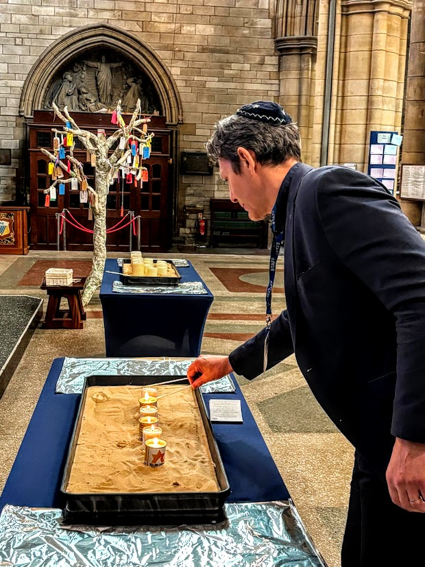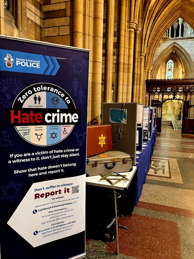 For the first time we had a Kehillat Kernow stand, put together by Jo Richler with a Kehillat Kernow roll-up banner designed by Paul Kleiman. On the stand’s table we had a number of items reflecting Judaism and the Jewish way of life including Shabbat candles and kiddush cup, havdala candles, a spice box, a chanukiah with 9 coloured candles in it, a selection of kippot, a siddur and a chumash. We also had a lit Yahrzeit candle. We set up about an hour before the service began down one of the naves, alongside a number of other stands from local groups and also a stand from the Association of Jewish Refugees. Having the stand provided an opportunity to meet and chat about Kehillat Kernow, and we had many interesting conversations including with the Mayor and Mayoress of Truro, and students from Truro School and Truro College.