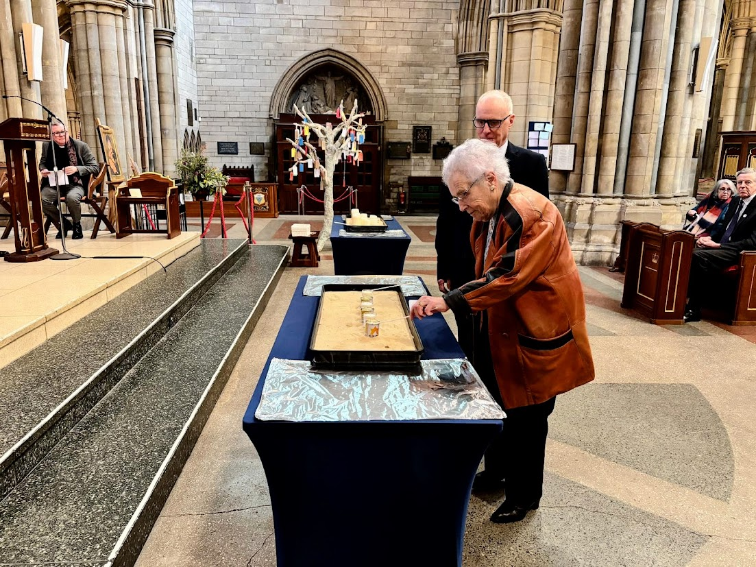 The well-attended service, whose theme was ‘Bridging Generations’, was led by Simon Robinson, the Dean of Truro Cathedral, and included a video introduction by Rob Rinder, poignant personal testimonies from Cynthia Hollinsworth and Susan Soyinka, poetry from Ben Barkow, and readings by students from Truro School. Six memorial candles were lit in memory of the 6 million inncluding one by Renate Collins, a Holocaust survivor, and then Jeremy Jacobson, the Kehillat Kernow Chair spoke. He was followed by Paul Kleiman singing ‘El Molei Rachamim’ the Jewish prayer recited at funerals and which has been specially adapted for HMD (see video at end of photos). The service ended with Adam Feldman reading out the traditional priestly blessing. Those attending then lined up to light memorial candles and to write pledges for action.