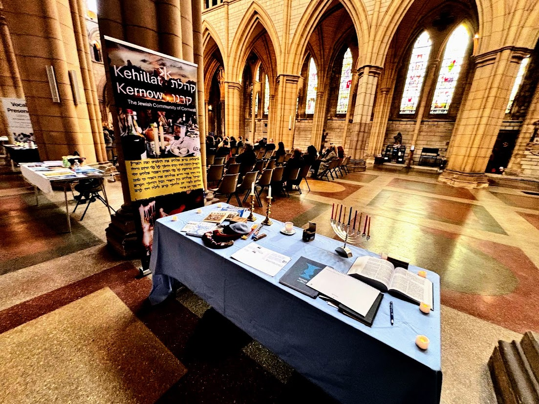 For the first time we had a Kehillat Kernow stand, put together by Jo Richler with a Kehillat Kernow roll-up banner designed by Paul Kleiman. On the stand’s table we had a number of items reflecting Judaism and the Jewish way of life including Shabbat candles and kiddush cup, havdala candles, a spice box, a chanukiah with 9 coloured candles in it, a selection of kippot, a siddur and a chumash. We also had a lit Yahrzeit candle. We set up about an hour before the service began down one of the naves, alongside a number of other stands from local groups and also a stand from the Association of Jewish Refugees. Having the stand provided an opportunity to meet and chat about Kehillat Kernow, and we had many interesting conversations including with the Mayor and Mayoress of Truro, and students from Truro School and Truro College.